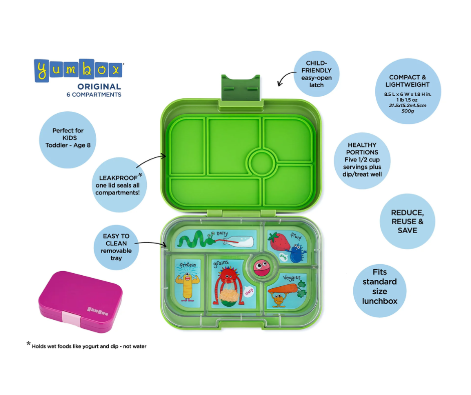 Yumbox Original's 6-compartment bento box is designed to simplify creating balanced meals. The built-in illustrated nutritional guide serves as a reminder for what and how much to pack.